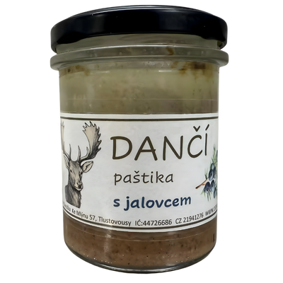 Složení: dančí maso 70%, vepřové maso 20%, jedlá sůl, jalovec, pepř, cibule, česnek, muškátový oříšek, majoránka, smetana, máslo