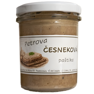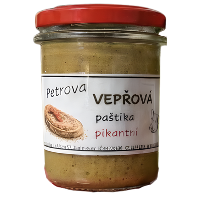 Složení: vepřová játra 38%, vepřové maso 58%, koření, sůl, zalito domácím vepřovým sádlem