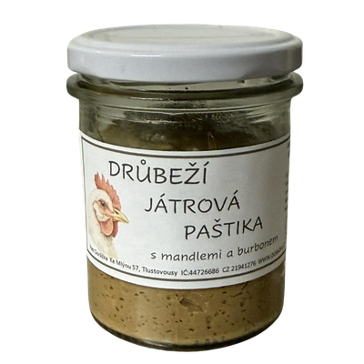 Složení: kuřecí játra 57%, pepř, muškátový květ, tymián, česnek, jedlá sůl, cibule, máslo, smetana, mandle, burbon