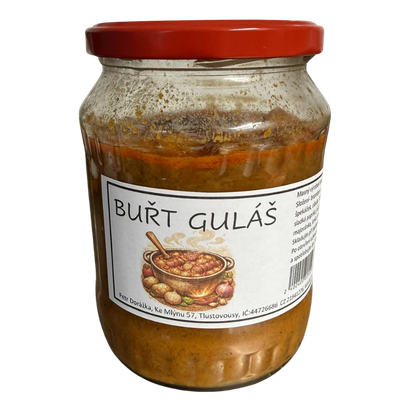Složení: hovězí maso 200g, cibule, česnek, sádlo, sladká paprika, sůl, pepř, kmín, voda, hl. mouka.