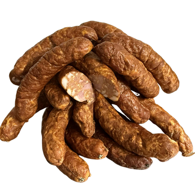 Složení: vepřové maso 98%, sůl (dusitanová solicí směs), pepř, česnek, muškátový květ, zázvor, koriandr, cukr, voda, vepřové střívko